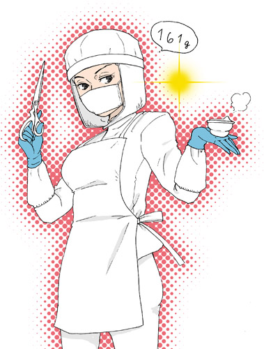 カップ持つ→餅入れる→鋏で切る→秤に乗せる→ベルトコンベアに乗せる