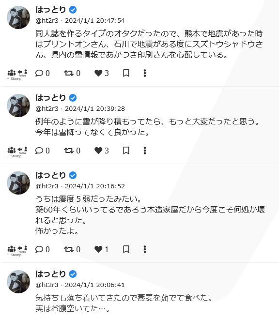 結構揺れたから家の外に出たら車庫(鉄パイプ組んだカーポート的な…)もグラグラしてるし、電柱も電線もゆらゆらしてるし…でも誰も外に出てこなかった…。